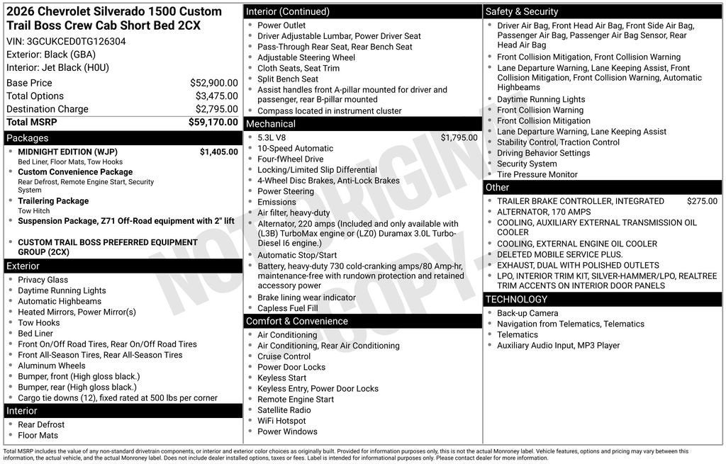 10-Speed Automatic, 4WD, Black Cloth. Internet Price includes the following incentives:$500 - Chevrolet Bonus Cash. Exp. 03/31/2026